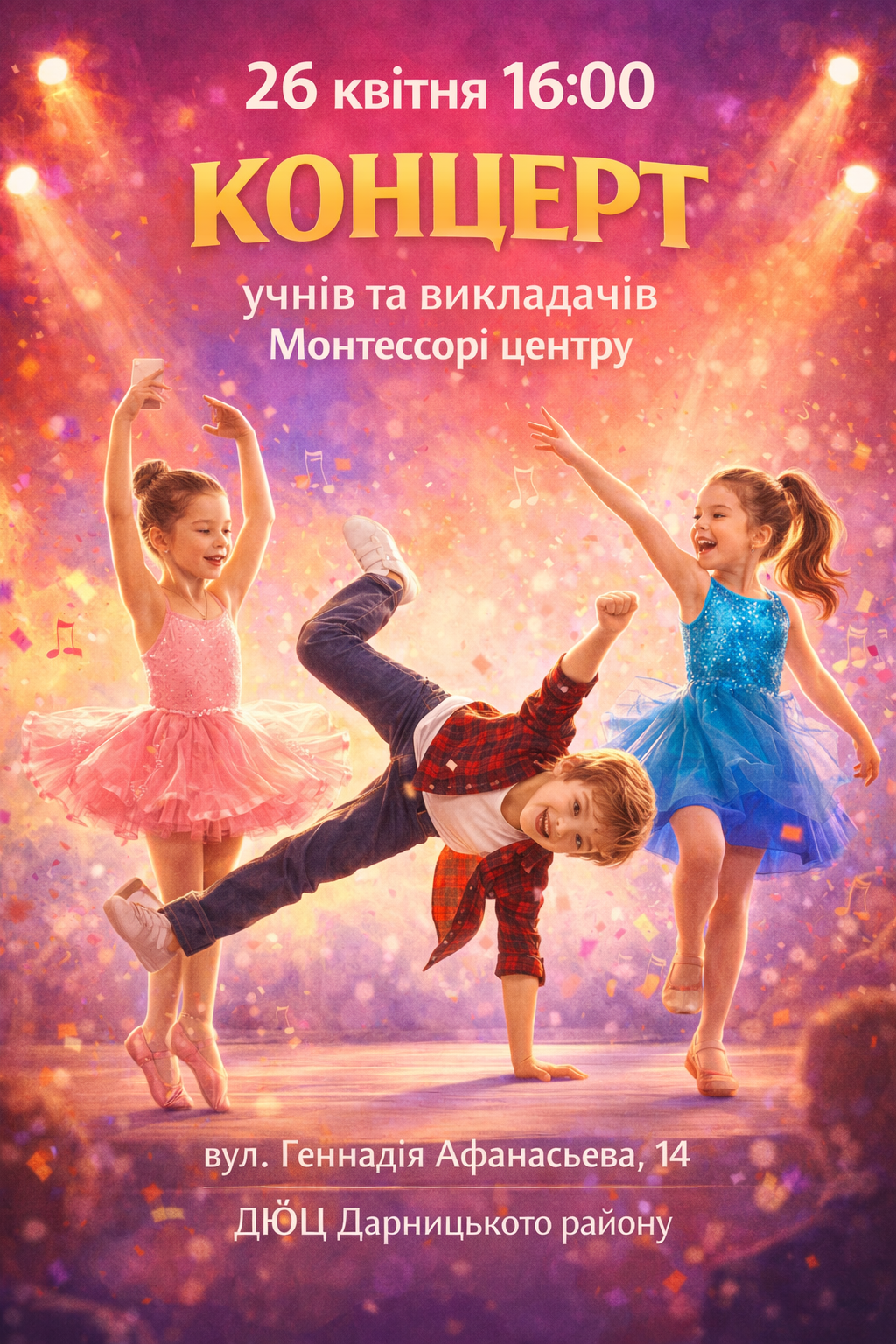 26 квітня у ДЮЦ Дарницького району відбудеться концерт студентів та викладачів школи мистецтв Монтессорі центр.