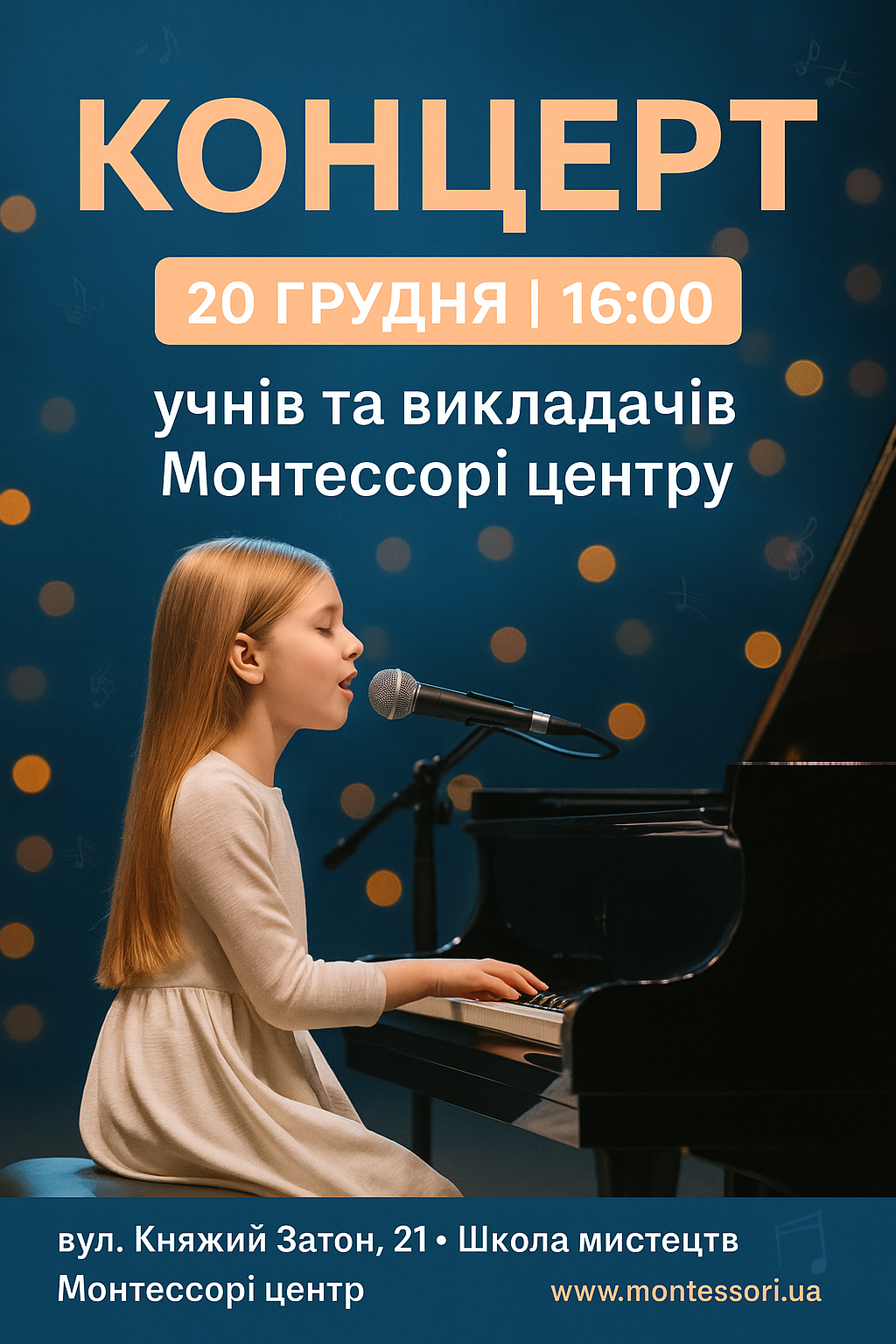 20 грудня о 16:00 запрошуємо на святковий концерт у школі мистецтв Монтессорі центр (вул. Княжий Затон, 21).